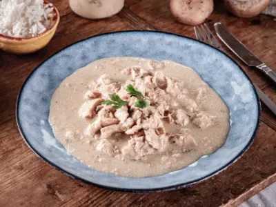 Schweinefleisch (74%), Trinkwasser, Zwiebeln, Pilze, Sahne (1%), Rapsöl, Speisesalz, Gewürze, modifizierte Stärke, Weizenmehl, Kartoffelstärke, Milcheiweiß, Würze, Aroma, Milchzucker, Karamell